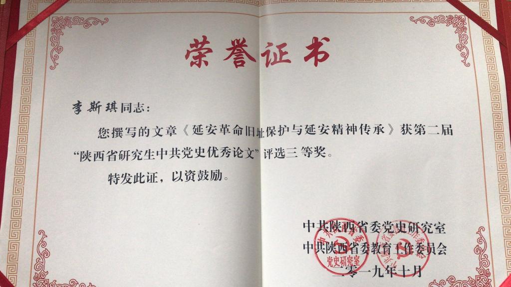 2019年11月5日,在中共陕西省委党史研究室举办的“第二届陕西省研究生中共党史优秀论文颁奖暨学习党史、新中国史研讨会”上,我院17级硕士生李思琪同学提交的论文《延安革命旧址保护于延安精神传承》获得第二届“陕西省研究生中共党史优秀论文”三等奖。